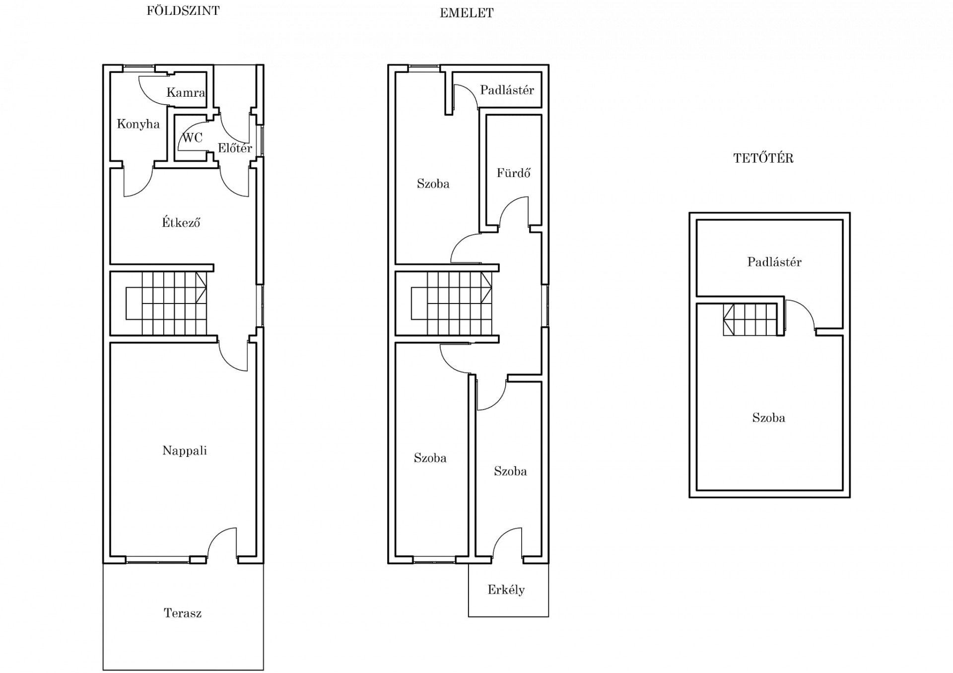 A földszinten konyha, étkező, nappali, kamra, WC és terasz található.